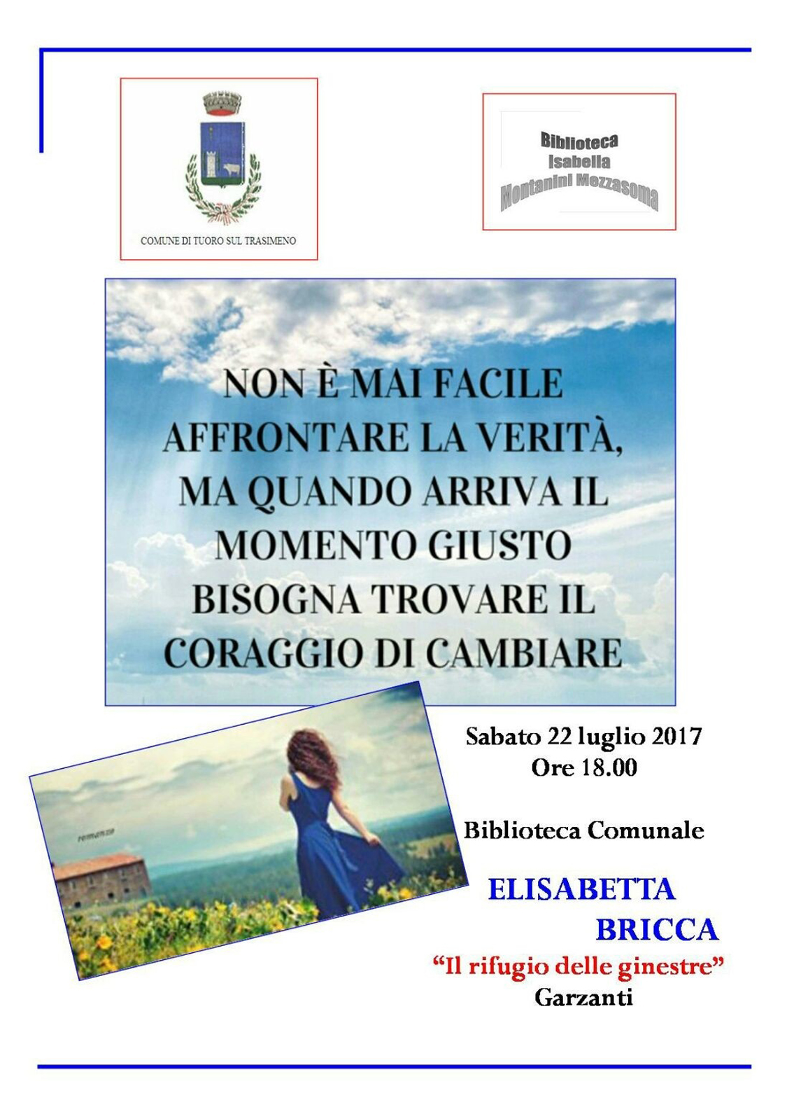 Home » Elisabetta Bricca presenta: “Il rifugio delle ginestre” Elisabetta Bricca presenta: “Il rifugio delle ginestre” Elisabetta Bricca presenta il suo romanzo d’esordio: “Il rifugio delle ginestre”. Sabato 22 Luglio, alle ore 18:00, a Tuoro sul Trasimeno, presso la Biblioteca Comunale “Isabella Montanini Mezzasoma”.