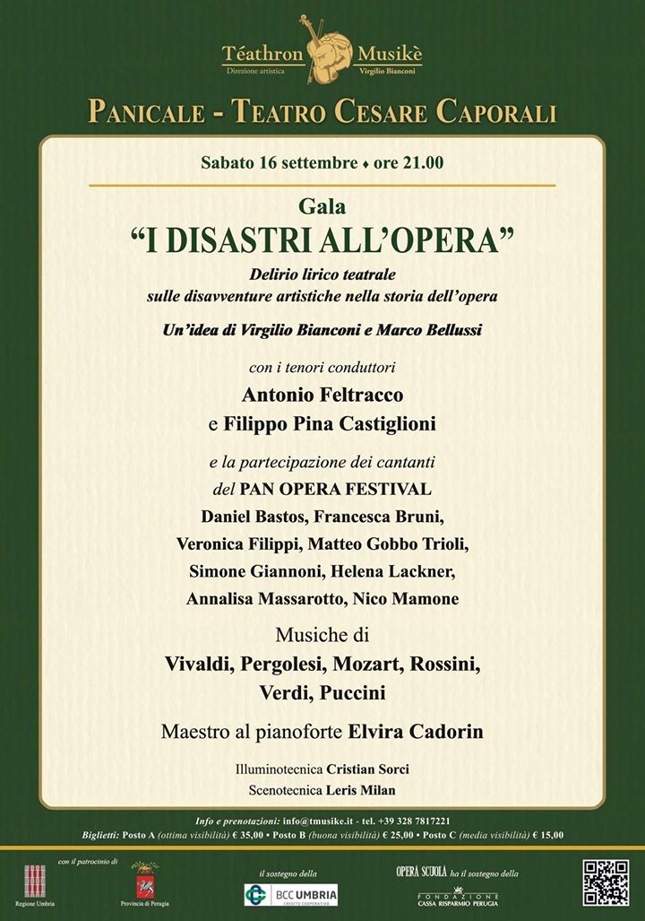 Al Teatro Caporali di Panicale va in scena “I disastri all’opera. Delirio lirico teatrale sulle disavventure artistiche nella storia dell’opera”. Il prossimo appuntamento del Pan Opera Festival, previsto per sabato 16 settembre alle ore 21, propone uno spettacolo prodotto in loco. Un gala lirico nato da un’idea di Virgilio Bianconi (direttore della manifestazione e presidente dell’associazione Teatronmusiké) e Marco Bellussi che vedrà protagonisti i tenori conduttori Antonio Feltracco e Filippo Pina Castiglioni. Vi prendono parte anche i cantanti del Pan Opera festival (Daniel Bastos, Francesca Bruni, Veronica Filippi, Simone Giannoni, Helena Lackner, Annalisa Massarotto, Nico Mamone). Lo spettacolo è costruito su musiche di Vivaldi, Pergolesi, Mozart, Rossini, Verdi e Puccini. Maestro al pianoforte sarà Elvira Cadorin.